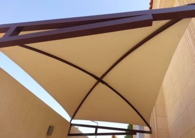 تتميز المظلات الهرمية بتصميمها الهندسي الأنيق الذي يضفي طابعاً من الهيبة والرقي. في مبتكر الظل، نصممها بدقة متناهية لتكون الخيار الأمثل لمداخل القصور، الفلل، والمجالس، حيث تجمع بين الشكل الجمالي الأخاذ والوظيفة العملية في تصريف مياه الأمطار ومنع تجمع الأتربة.